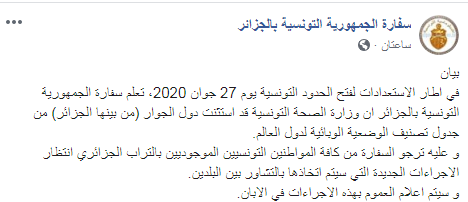 وجاء في بيان للسفارة، على صفحتها الرسمية بالفايسبوك: “في اطار الاستعدادات لفتح الحدود التونسية يوم 27 جوان 2020، تعلم سفارة الجمهورية التونسية بالجزائر أن وزارة الصحة التونسية قد استثنت دول الجوار (من بينها الجزائر) من جدول تصنيف الوضعية الوبائية لدول العالم”.