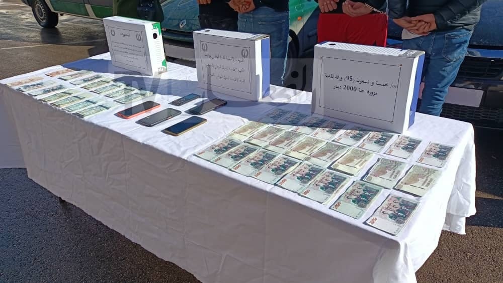 وجاءت العملية في اطار محاربة اللصوصية واستغلالا لمعلومات مؤكدة، حيث مكنت من توقيف 5 أشخاص من بينهم إمرأة. مع حجز كمية من الأموال المزورة مقدر 190 ألف دج. ومبلغ مالي اخر صحيح مقدر بـ 212 ألف دج يعتبر من عائدات الإجرام مع حجز مركبتين في العملية.