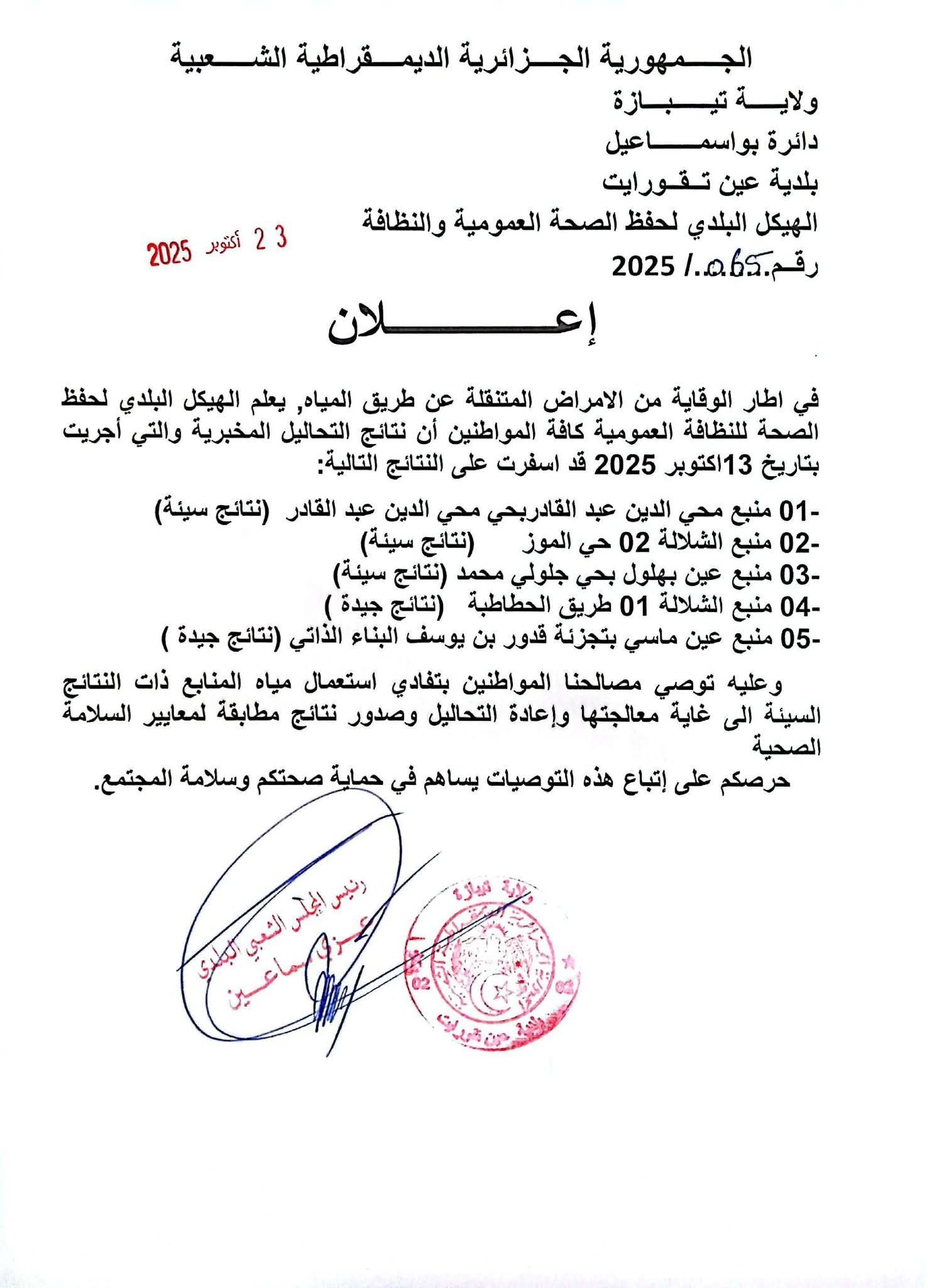وبهذا، يعلم الهيكل البلدي لحفظ الصحة للنظافة العمومية كافة المواطنين أن نتائج التحاليل المخبرية التي أجريت بتاريخ 13 اكتوبر 2025. أسفرت عمّا يلي:
