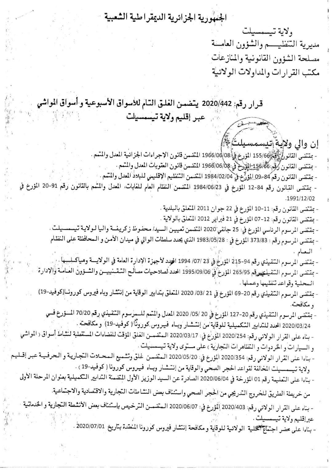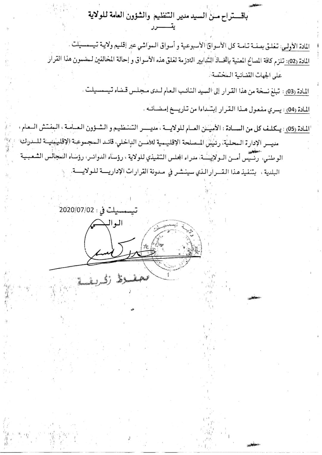 قرر والي ولاية تيسمسيلت زكريفة محفوظ اليوم الخميس الغلق التام للأسواق الأسبوعية وأسواق المواشي عبر إقليم الولاية.