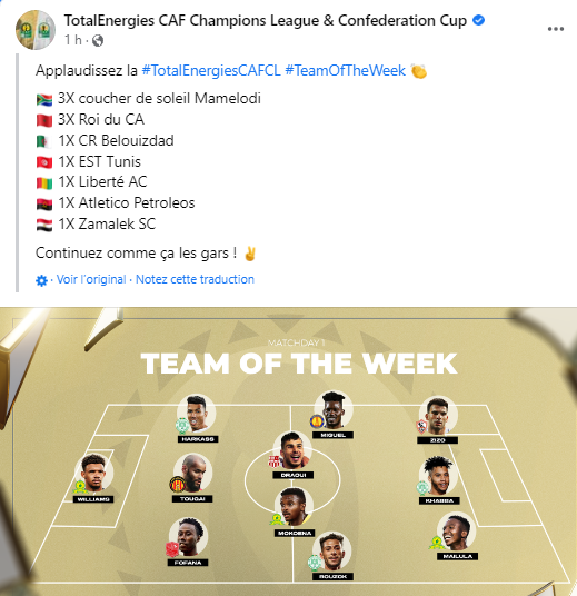 وكشف الإتحاد الإفريقي لكرة القدم اليوم عبر صفحته الرسمية “الفايسبوك”، عن التشكيلة المثالية، أين تواجد دراوي الذي تألق في مباراة فريقه شباب بلوزداد أمام الزمالك المصري.