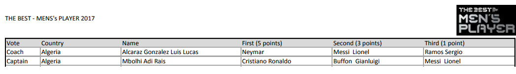 وبخصوص المنتخب الوطني، فالقائد “مبولحي” صوّت لـ: “رونالدو أولا، بوفون ثانيا وليونيل ميسي ثالثا”.