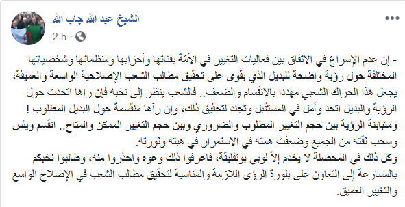 ودعا جاب الله شباب الحراك، إلى ضرورة مطالبة النخبة بالمسارعة إلى التعاون على بلورة الرؤى اللازمة والمناسبة، لتحقيق مطالب الشعب.