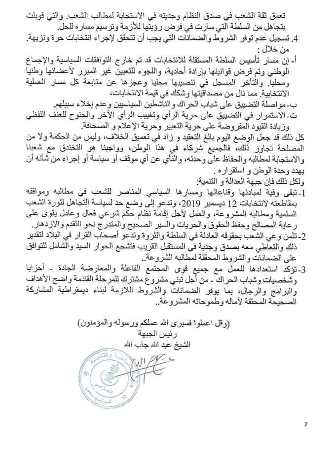 وقالت جبهة العدالة و التنمية انها تبقى وفية لمبادئها وقناعاتها ومسارها السياسي المناصر للشعب في مطالبه ومواقفه بمقاطعته الانتخابات.