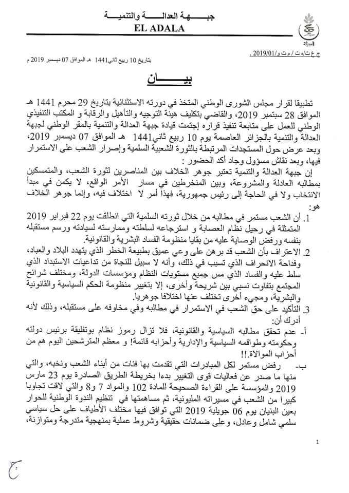 وقالت جبهة العدالة و التنمية انها تبقى وفية لمبادئها وقناعاتها ومسارها السياسي المناصر للشعب في مطالبه ومواقفه بمقاطعته الانتخابات.