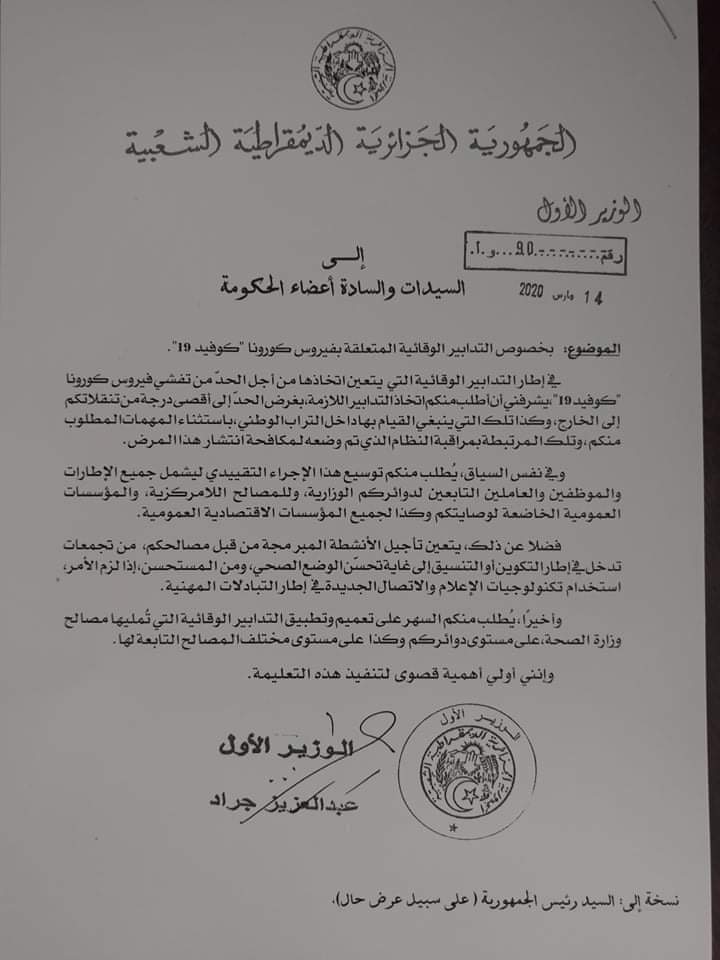 وطالبت التعليمة من الوزراء بتوسيع الإجراء ليشمل جميع الإطارات والموظفين والعاملين التابعين لدوائرهم الوزارية، والمؤسسات العمومية والاقتصادية.