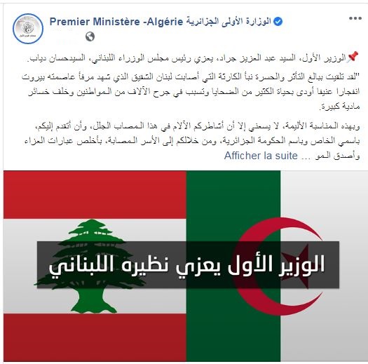 وبهذه الـمناسبة الأليمة، لا يسعني إلا أن أشاطركم الآلام في هذا الـمصاب الجلل، وأن أتقدم إليكم، باسمي الخاص وباسم الحكومة الجزائرية، ومن خلالكم إلى الأسر الـمصابة، بأخلص عبارات العزاء وأصدق الـمواساة والتعاطف، داعيا الـمولى العلي القدير أن يتغمد أرواح الضحايا الطاهرة بواسع رحمته وغفرانه وأن يلهم ذويهم الصبر والسلوان، كما أسأله سبحانه وتعالى، أن يعجل بشفاء الجرحي، ويحفظ الشعب اللبناني الشقيق من كل مكروه.
