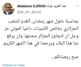 “بمناسبة حلول شهر رمضان المبارك اتقدم للشعب الجزائري بخالص الأمنيات داعيا المولى عز وجل أن تتجاوز الجزائر محنتها وان يرفع عنا هذا البلاء ويرحمنا في هذا الشهر الكريم ”