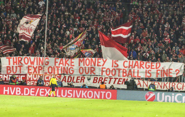 وكتبت الجماهير البافارية في لافتات موجهة للاتحاد الأوروبي: “نعاقب بعد رمينا لأموال مزوة. لكن إستغلالكم كرة القدم شيء جيد !”