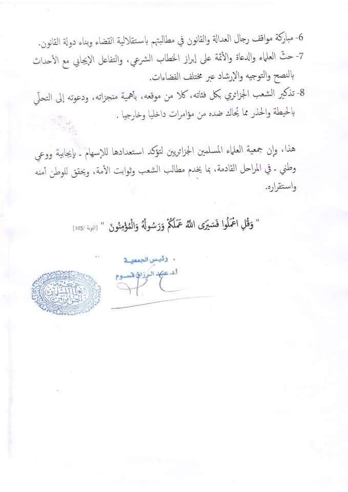 جمعية العلماء المسلمين: الأئمة والعلماء مطالبون بالتفاعل الإيجابي مع أحداث الحراك