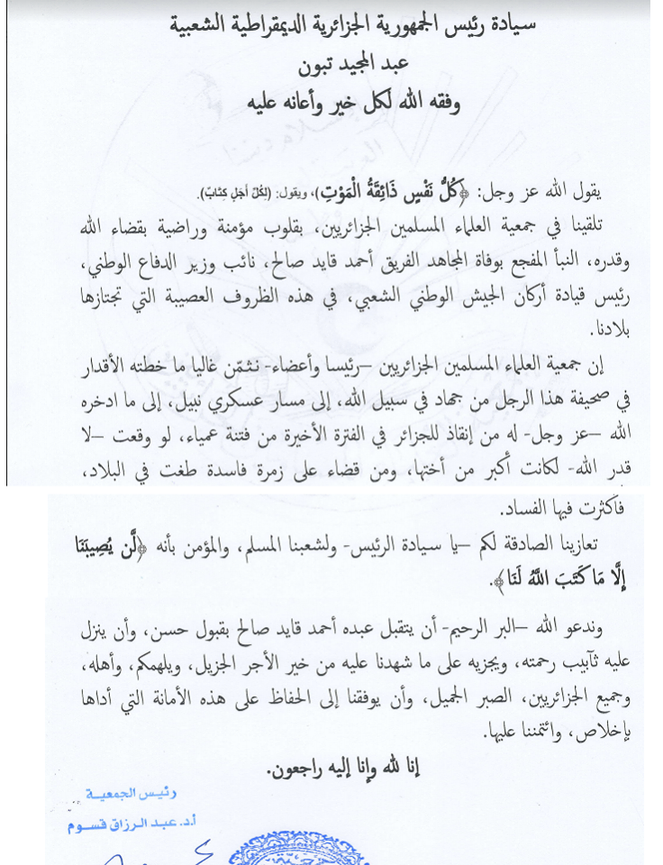 قالت جمعية العلماء المسلمين أن الفريق أحمد قايد صالح أنقذ الجزائر من فتنة عمياء، لو وقعت لكانت أكبر من العشرية السوداء.