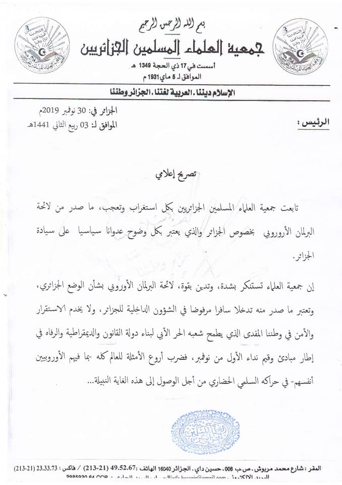 إستنكرت جمعية العلماء المسلمين وأدانت، لائحة البرلمان الاوروبي بشأن الوضع في الجزائر.