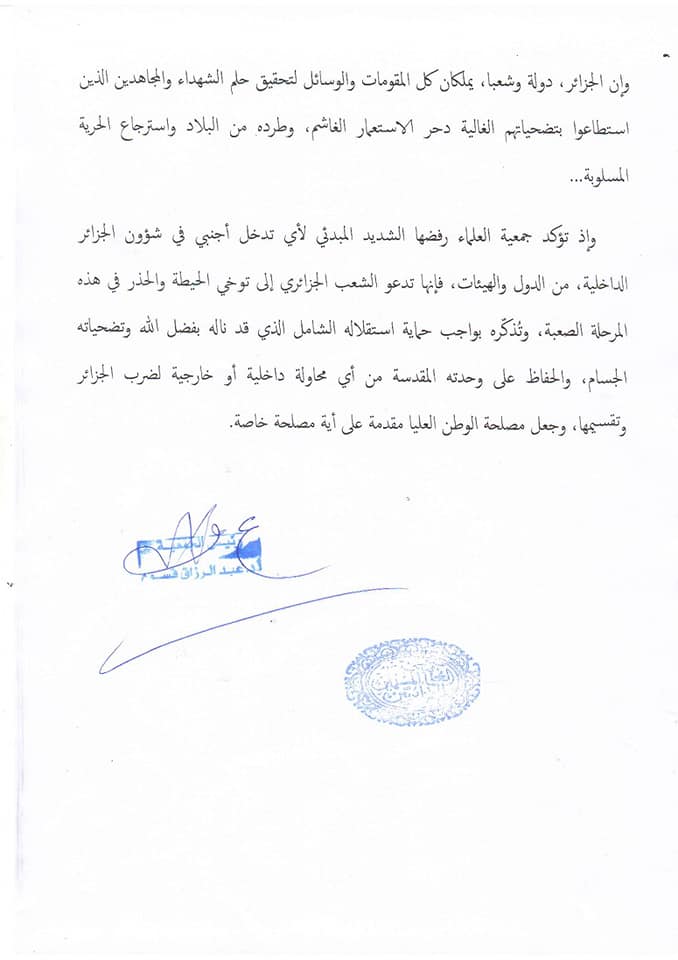 وأكدت جمعية العلماء المسلمين الجزائريين رفضها الشديد لأي تدخل أجنبي في الشؤون الداخلية للجزائر، كما دعت الجزائريين لتوخي الحيطة والحذر في هذه المرحلة الصعبة.
