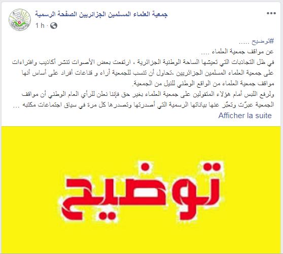 وقالت الجمعية في توضيح لها على صفحتها الرسمية في فايسبوك: في ظل التجاذبات التي تعيشها الساحة الوطنية الجزائرية، ارتفعت بعض الأصوات تنشر أكاذيب وافتراءات على جمعية العلماء المسلمين الجزائريين ،تحاول أن تنسب للجمعية آراء و قناعات أفراد على أساس أنها مواقف جمعية العلماء من الواقع الوطني للنيل من الجمعية.