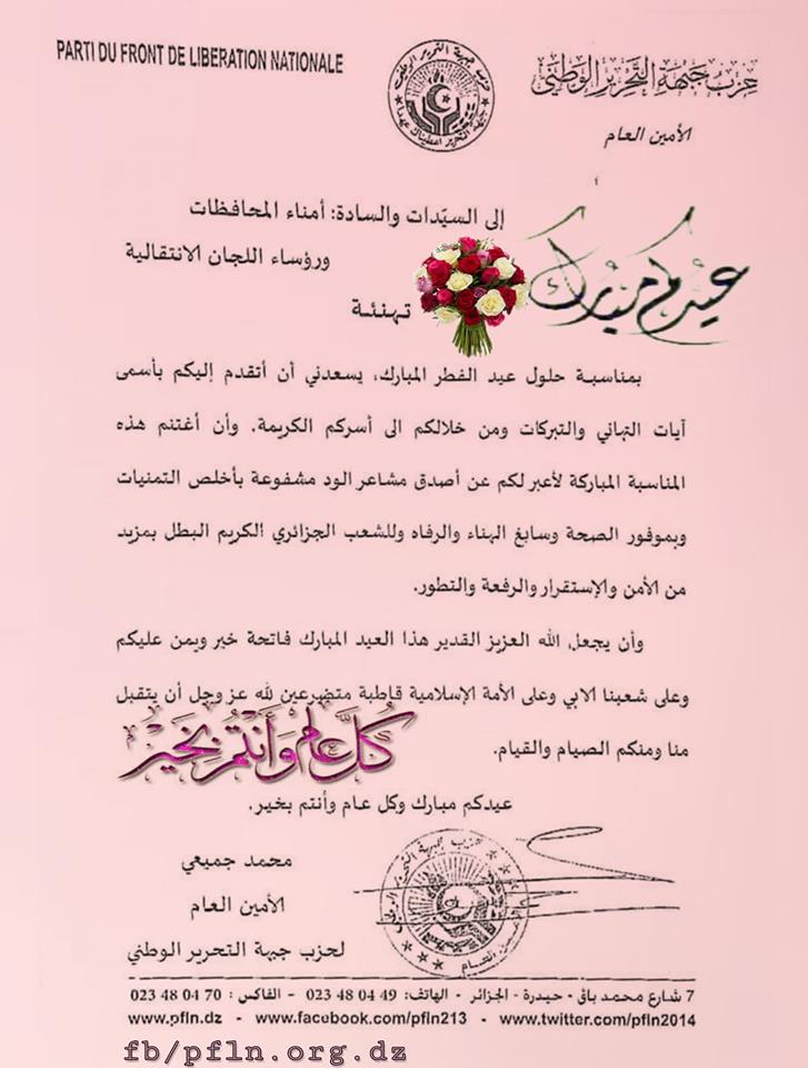 هنّأ الأمين العام لحزب جبهة التحرير الوطني، “أفلان”، محمد جميعي الجزائريين والجزائريات بمناسبة حلول عيد الفطر المبارك.