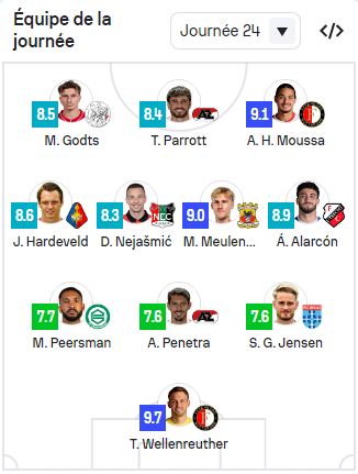 ونشر موقع “سوفاسكور” تشكيلة الجولة الـ 24 من “الإريديفيزي”، والتي عرفت تواجدا متوقعا لنجم فينورد روتردام، أنيس حاج موسى.