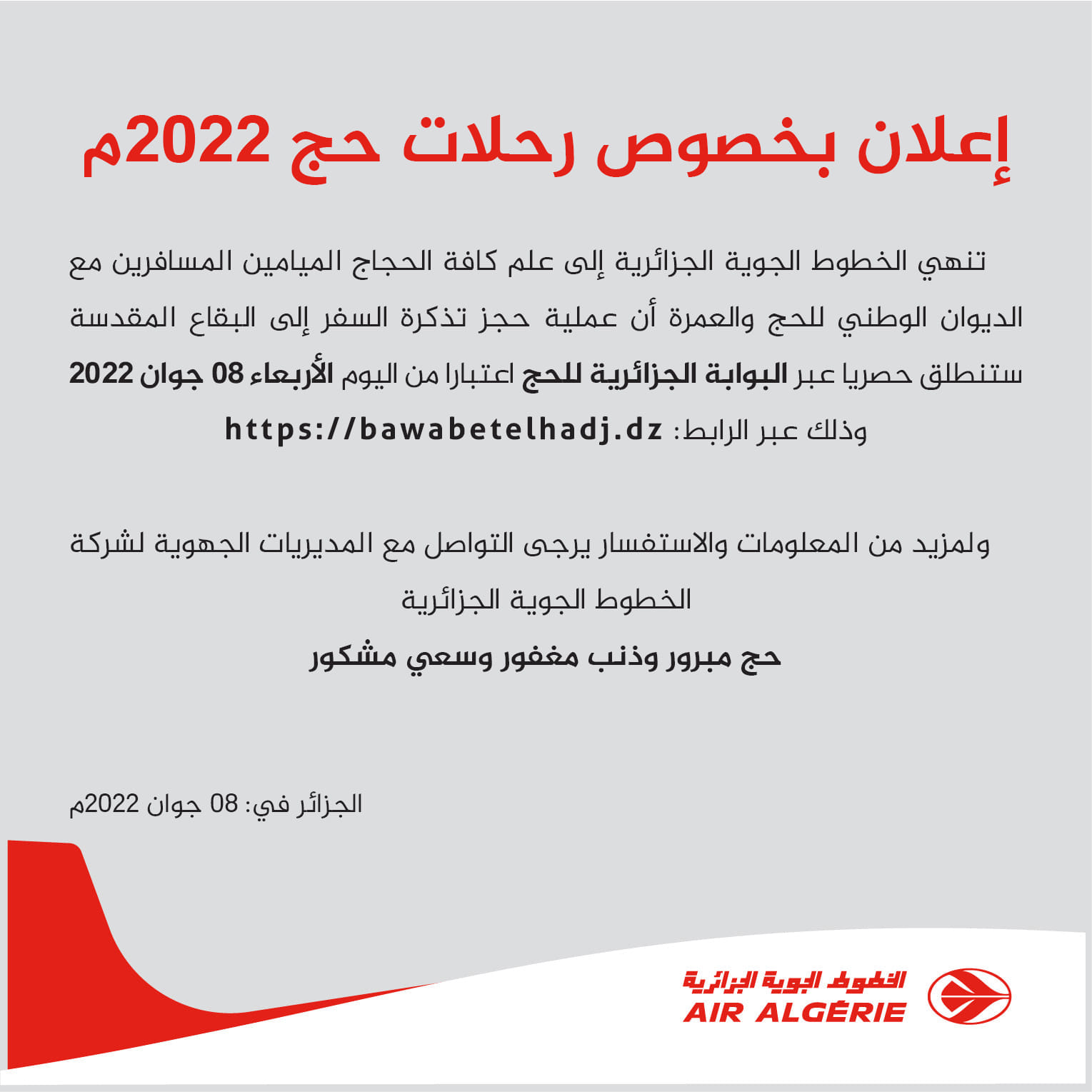 كما تنهي علم إلى الحجاج الميامين ان الحجز الإلكتروني لتذاكر السفر إلى البقاع المقدسة عبر البوابة الجزائرية للحج: https://bawabetelhadj.dz.