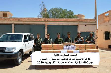 ضبطت مفرزة للجيش الوطني الشعبي، بالتنسيق مع عناصر الدرك الوطني، ببوسمغون، ولاية البيض، كمية ضخمة من الكيف المعالج تُقدر بخمسة قناطير.
