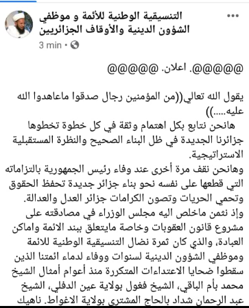ثمنت التنسيقية الوطنية للأئمة وموظفي الشؤون الدينية والأوقاف الجزائريين قرارات رئيس الجمهورية خلال إجتماع الوزراء اليوم.