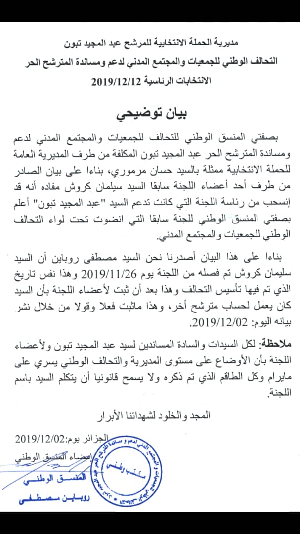 أصدر ما يسمى بالتحالف الوطني للجمعيات والمجتمع المدني لمساندة المترشح عبد المجيد تبون، بيانا مساء اليوم الإثنين، ردا على بيان آخر نشره منشقون عن حملة المترشح.