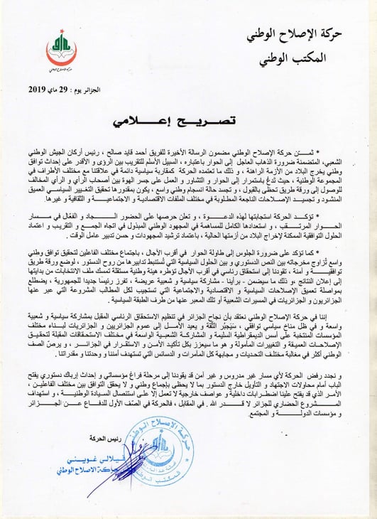 ثمنت حركة الإصلاح الوطني مضمون الرسالة الأخيرة للفريق أحمد قايد صالح، رئيس أركان الجيش الوطني الشعبي، المتضمنة ضرورة الذهاب العاجل