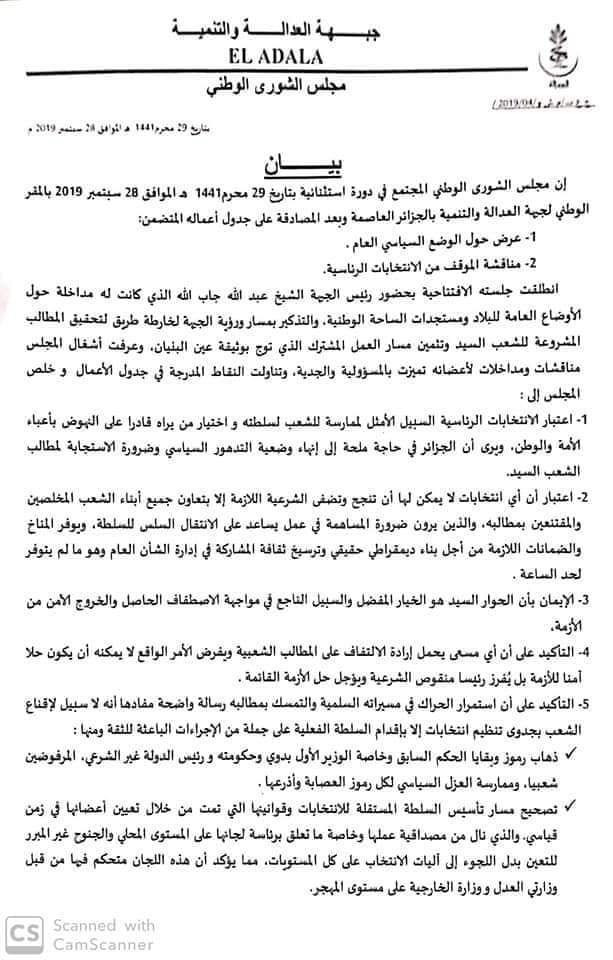وأكدت الجبهة على أن استمرار الحراك في مسيراته السلمية والتمسك بمطالبه رسالة واضحة مفادها أنه لا سبيل لإقناع الشعب بجدوى تنظيم انتخابات إلا بإقدام السلطة الفعلية على جملة من الإجراءات الباعثة للثقة .