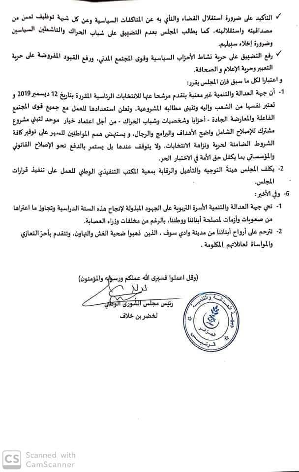 كما اكدت على ضرورة استقلال القضاء والنأي به عن المناكفات السياسية وعن كل شبهة توظيف تمسّ من مصداقيته واستقلاليته، كما يطالب المجلس بعدم التضييق على شباب الحراك والناشطين السياسين وضرورة إخلاء سبيلهم.