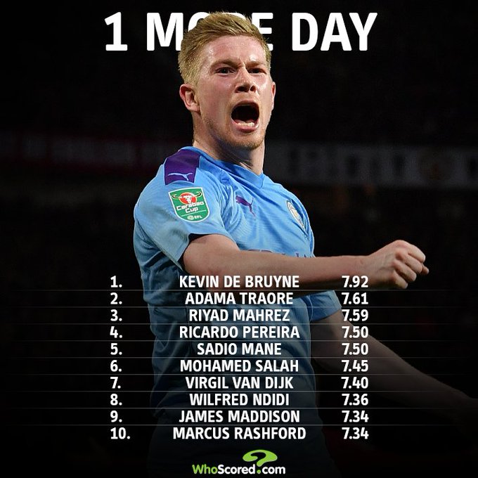 وقبل يوم واحد عن عودة منافسة الدوري الإنجليزي، نشر موقع “هوسكورد” قائمة تضم أفضل اللاعبين هذا الموسم، والتي تصدرها البلجيكي كيفين دي بروين بـ 7,92 نقطة، يتبعه اللاعب الإسباني آداما تراوري بـ 7,61 نقطة، والجزائري رياض محرز ثالثا بـ 7,59 نقطة.