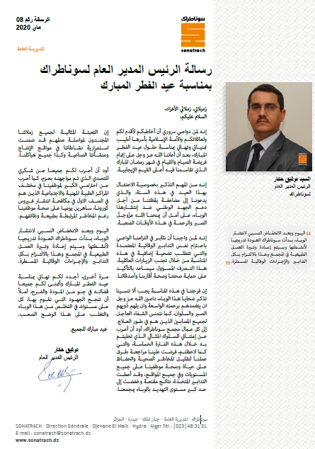 وجه، اليوم الأحد، الرئيس المدير العام لمجمع سوناطراك، توفيق حكار، رسالة تهنئة لعمال وعاملات المجمع بمناسبة عيد الفطر المبارك.
