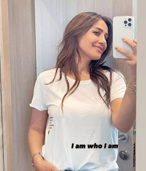 ونشرت الفنانة، صورا لها، ظهرت فيها بدون حجاب وهي تستعرض شكلها أمام المرأة.