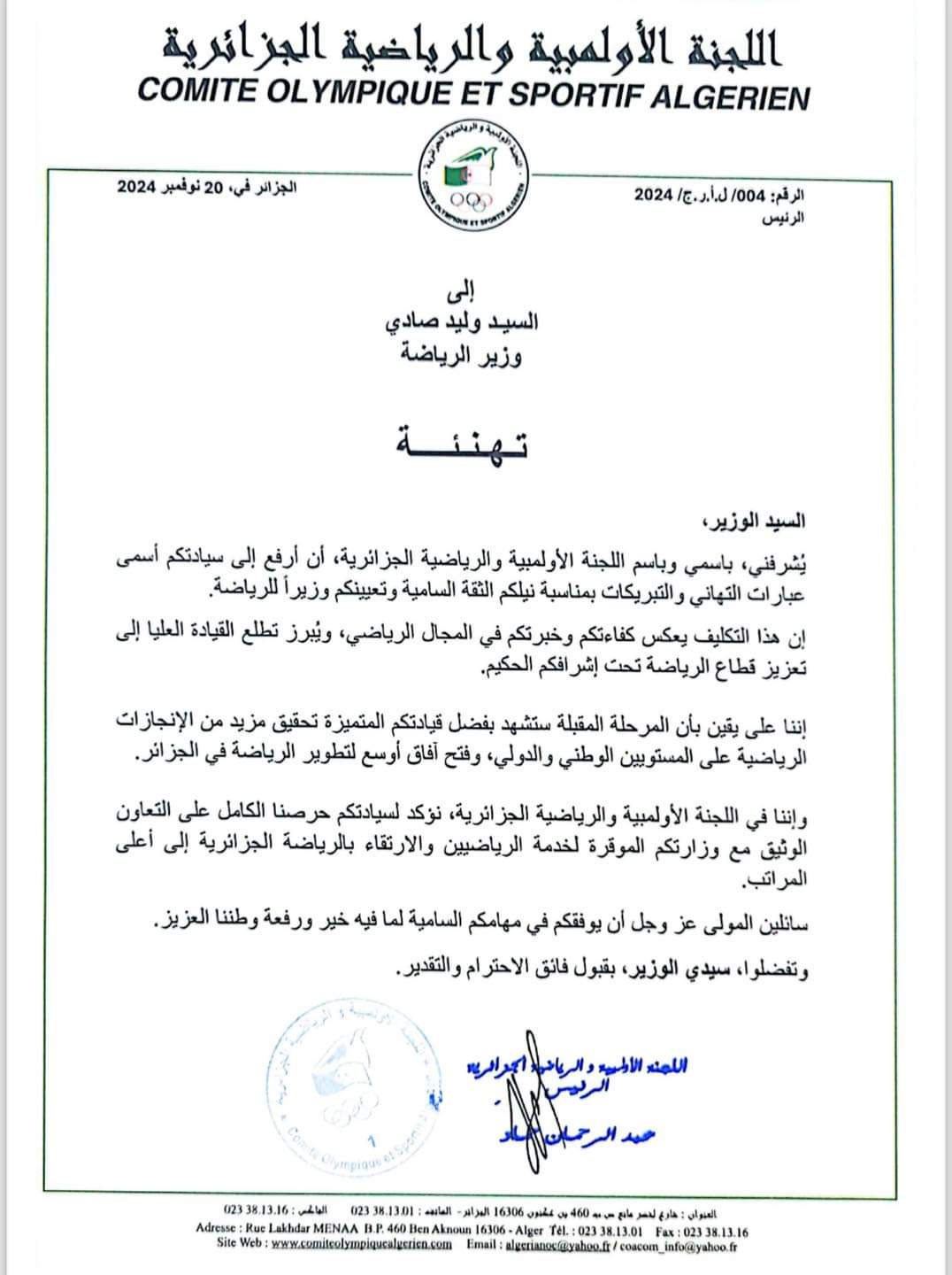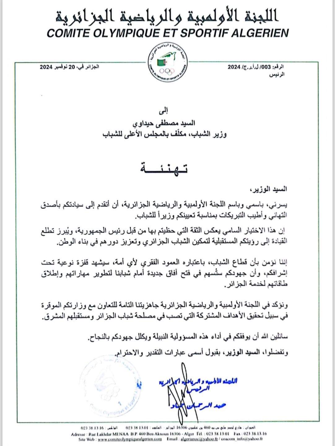 وجّه رئيس اللجنة الأولمبية والرياضية الجزائرية، عبد الرحمان حماد، رسالتي تهنئة، لكل من وليد صادي، ومصطفى حيداوي، على اعتلائهم منصبين جديدين.