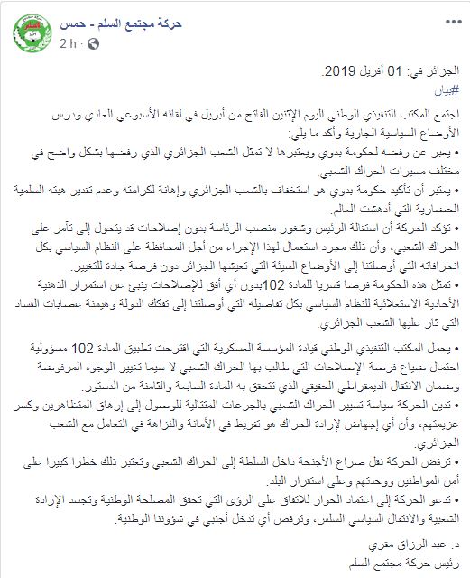 كما جاء في البيان بأن استقالة الرئيس وشغور منصب الرئاسة بدون إصلاحات، قد يتحول إلى تآمر على الحراك الشعبي.