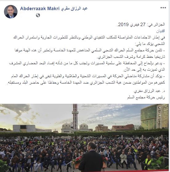 وبالنظر للتطورات الجارية واستمرار الحراك الشعبي، حيث أكد على  تثمن حركة حمس الحراك الشعبي السلمي المناهض للعهدة الخامسة.