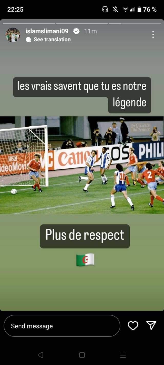 كما طالب عدد من الرياضيين بضرورة احترام الرجل خاصة في حدث خارجي وإفريقي، أبرزه الدولي الجزائري إسلام سليماني الذي قال عبر صفحته الرسمية على الفايسبوك “الحقيقة يجب أن تعرف أننا نملك أسطورة حقيقية”.