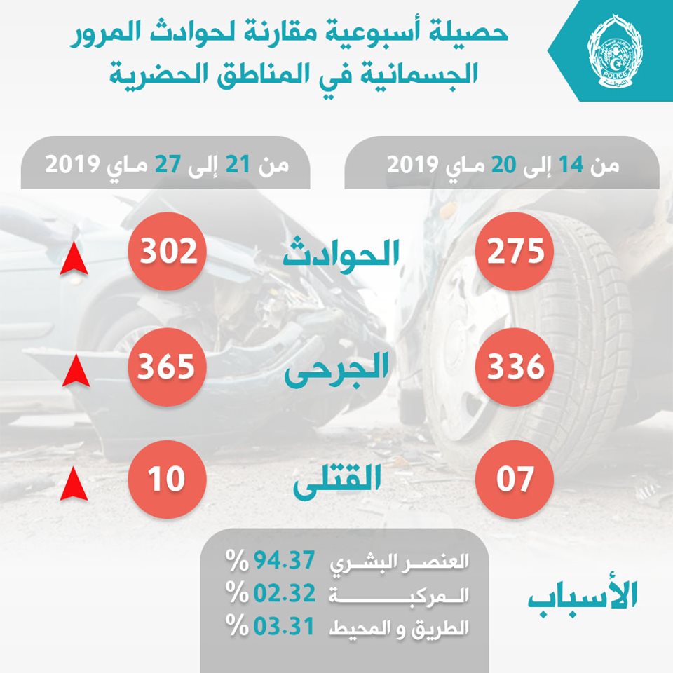 وأوضح بيان من مصالح الامن الوطني أنه “مقارنة بالإحصائيات المسجلة في الأسبوع الماضيي عرفت حصيلة حوادث المرور ارتفاعا قدر بـ +27 حادثي كما ارتفع عدد الجرحى بـ +29 حالةي و عدد الوفيات بـ +03 حالة”.