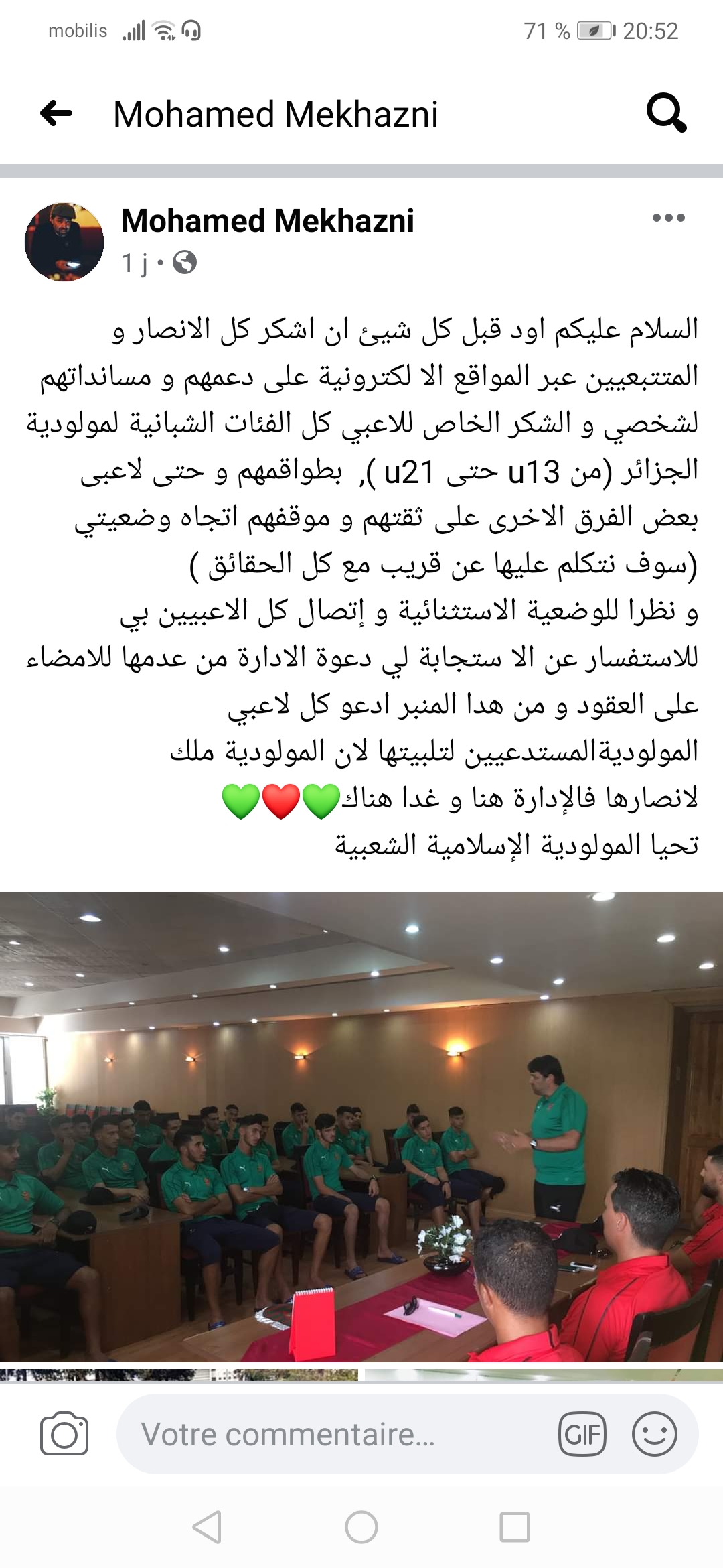 ميخازني وفي ظل كثرة الأقاويل خرج عن صمته بمنشور على الفايسبوك تعهد فيه بكشف حقائق وضعيته قريبا مطالبا خلاله أيضا اللاعبين الشبان بتلبية طلب الإدارة والامضاء على العقود حتى في ظل ابعاده.