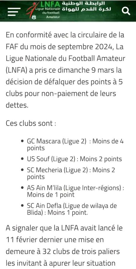 أعلنت رابطة الهواة عن خصم نقاط من رصيد عدد من الأندية بسبب مخالفات في القواعد المالية، أبرزهم الفريق العريق غالي معسكر الناشط في القسم الثاني هواة وسط غرب.