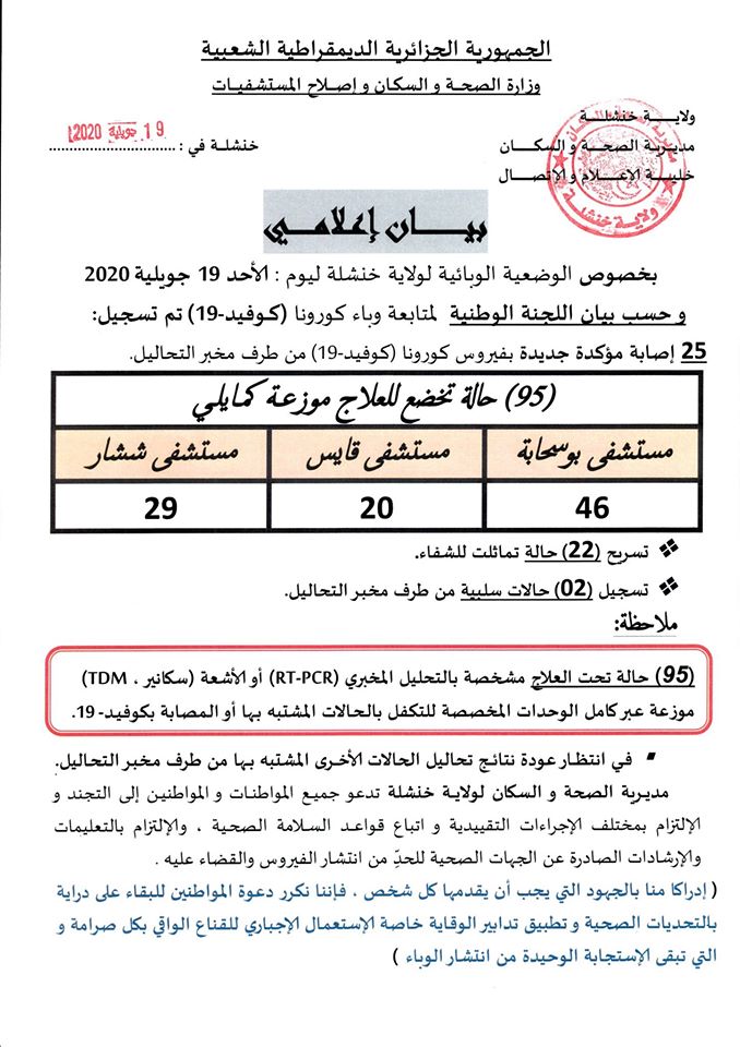 سجلت ولاية خنشلة 25 إصابة مؤكدة بفيروس كورونا خلال ال24 ساعة الماضية.