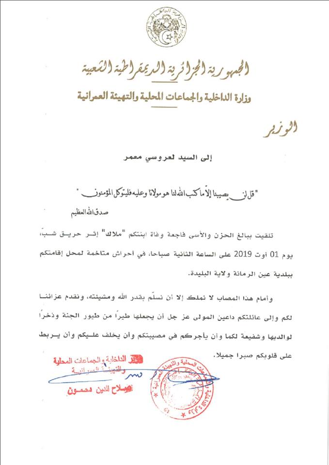 عزى وزير الداخلية صلاح الدين دحمون عائلة الطفلة لعروسي ملاك التي توفيت احتراقا في حريق بلدية الريحان بدائرة موزاية ولاية البليدة.