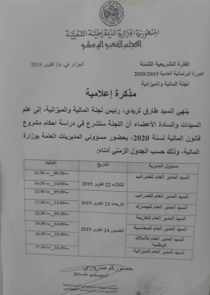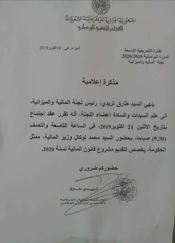 ستدرس لجنة المالية والميزانية بالمجلس الشعبي الوطني برئاسة طارق تريدي مشروع قانون المالية لسنة 2020 بحضور الوزير محمد لوكال.