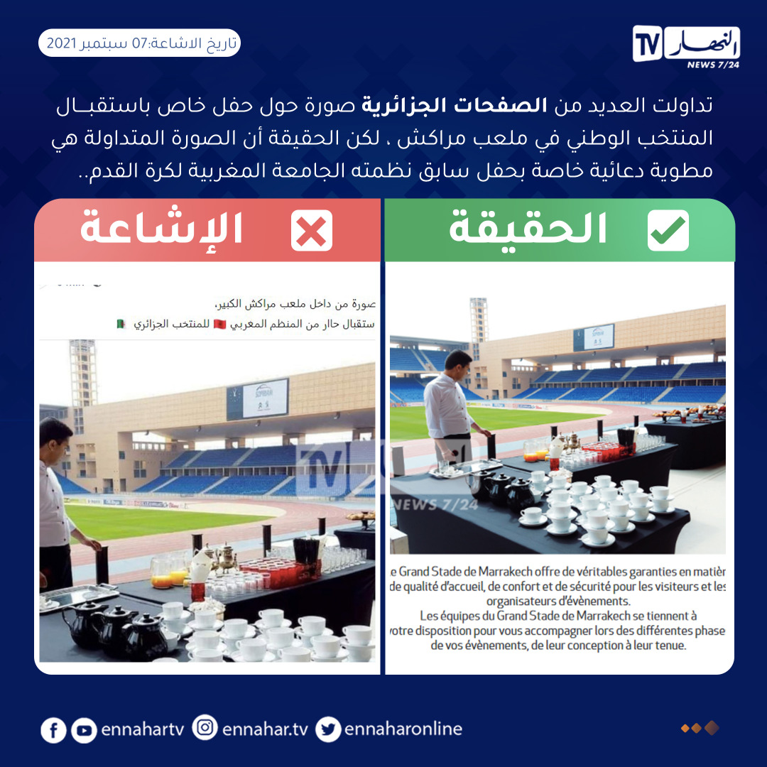 ونوضح بأن ما يتم تداوله، لا يتجاوز محض الدعاية الكاذبة، ورسم صورة عن إستقبال فخم مُبالغ فيه لمُحاربي الصحراء، في وقت أن الصورة قديمة جدا، وتعود لمطوية مضى عنها سنوات عديدة، كان الغرض منها الإشهار لإستضافة هذا الملعب للعديد من الأحداث الرياضية وغيرها.