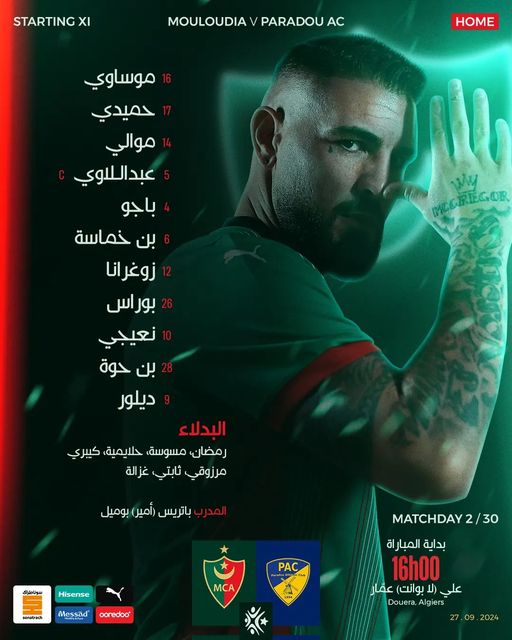 يوجد الدولي الجزائري أندي ديلور في التشكيلة الأساسية التي سيعتمد عليها مدرب الفريق أمير بوميل خلال مواجهة نادي بارادو.