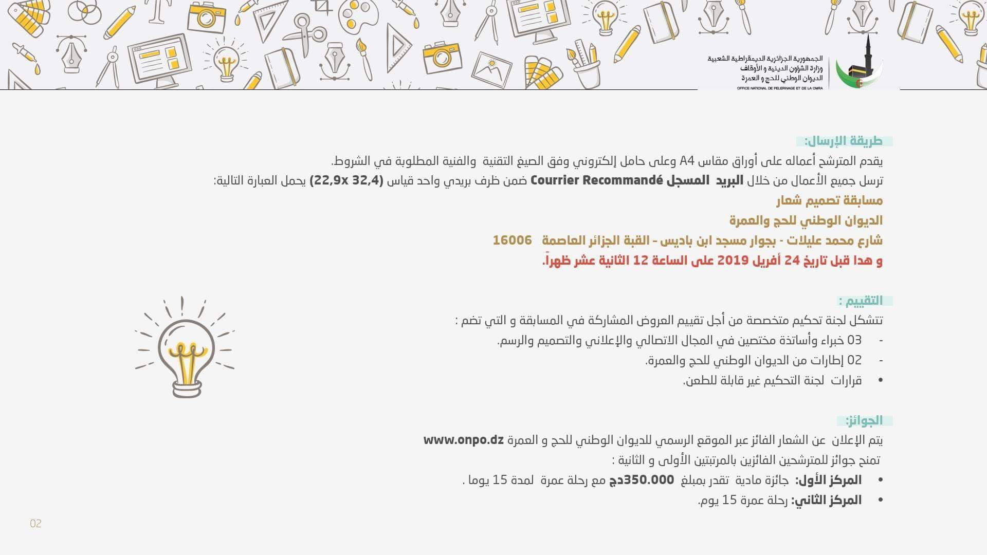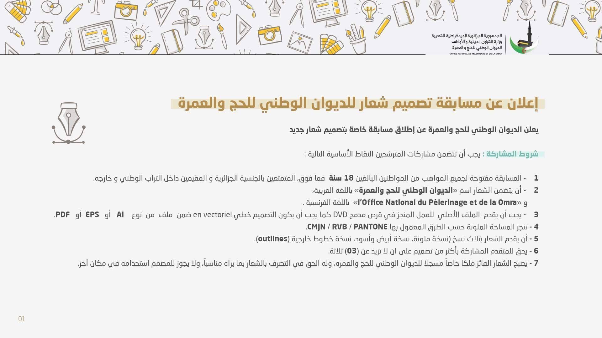 أطلق الديوان الوطني للحج والعمرة مسابقة لتصميم شعار جديد له، يكون باللغتين العربية والفرنسية، ويمكن المشاركة بـ3 عروض مختلفة.