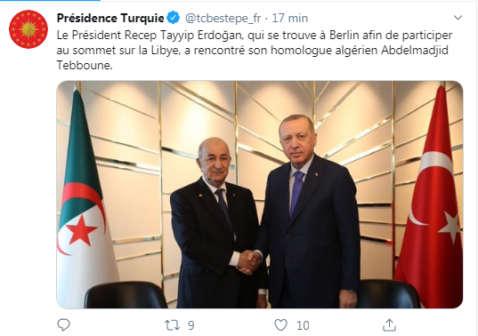 أفادت رئاسة الجمهورية التركية، اليوم الأحد في بيان لها نشر عبر موقعها الرسمي على تويتر، عن لقاء جمع الرئيس أردوغان بنظيره الجزائري، عبد المجيد تبون على هامش مشاركتهم في القمة حول ليبيا في برلين.