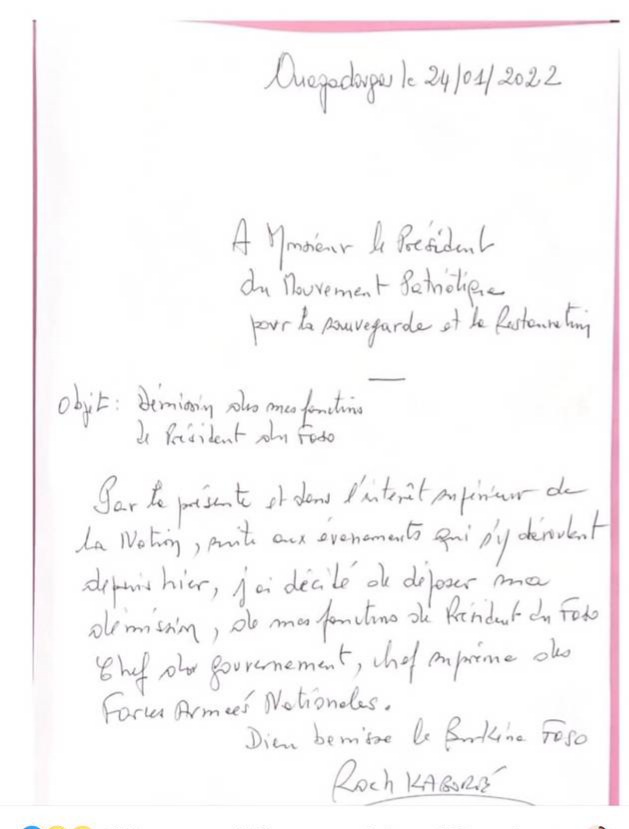قدم رئيس بوركينافاسو، روك مارك كريستيان كابوري، استقالته من منصبه في رسالة مكتوبة، تم تداولها على نطاق واسع. كما قال كابوري بالرسالة المكتوبة بخط اليد، إنه قرر اعتبارا للمصلحة العليا للأمة تقديم الاستقالة من منصبه.