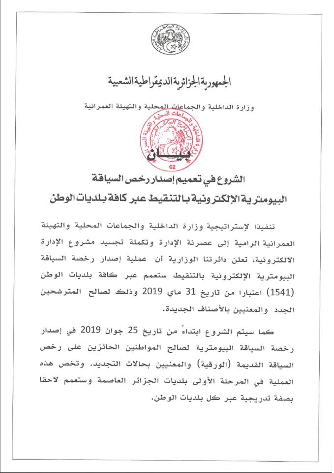 السياقة الورقية القديمة، بداية من 25 جوان الجاري، وذلك بكل بلديات العاصمة كمرحلة أولى، قبل تعميمها على كافة بلديات الوطن.