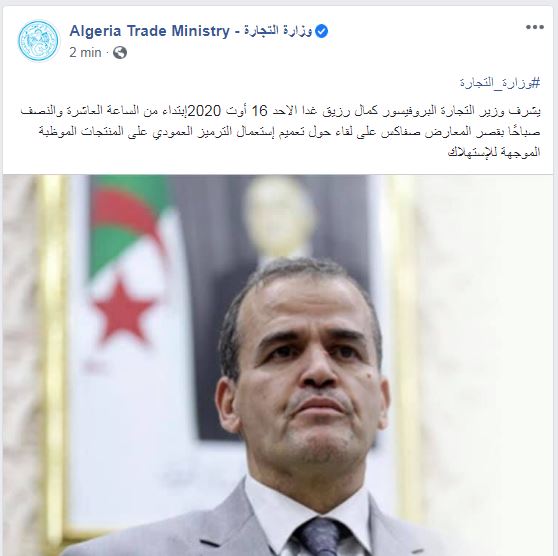 يشرف وزير التجارة كمال رزيق غدا الأحد على لقاء حول تعميم إستعمال الترميز العمودي على المنتجات الموظبة الموجهة للإستهلاك.
