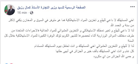 ونشر رزيق: اخي المستهلك لا داعي للهلع و تخزين المواد الاستهلاكية فما هو متوفر في السوق و المخازن يكفي لاكثر من سنة و الحمد الله.