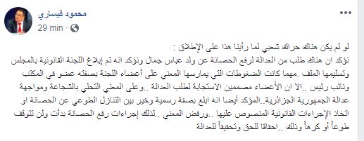 وأفاد في منشور له على فيسبوك، أنه تم إبلاغ اللجنة القانونية بمجلس الامة وتسليمها الملف، لرفع الحصانة على ولد عباس.