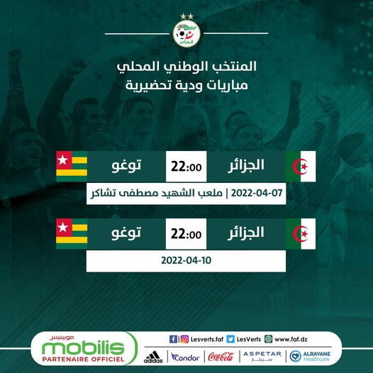 المواجهة الودية الأولى مُقررة يوم الخميس المُقبل 07 أفريل 2022 بملعب الشهيد مصطفى تشاكر بالبليدة بداية من العاشرة ليلا.